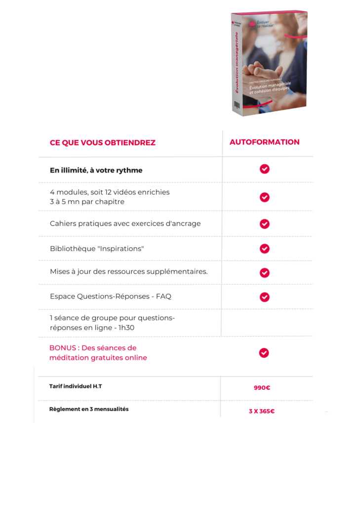 En autoformation : 7 modules de 3 chapitres chacun soit 21 chapitres enrichis de vidéos, diagnostics, cahiers pratiques, bibliothèque d’inspiration, quiz d’ancrage.